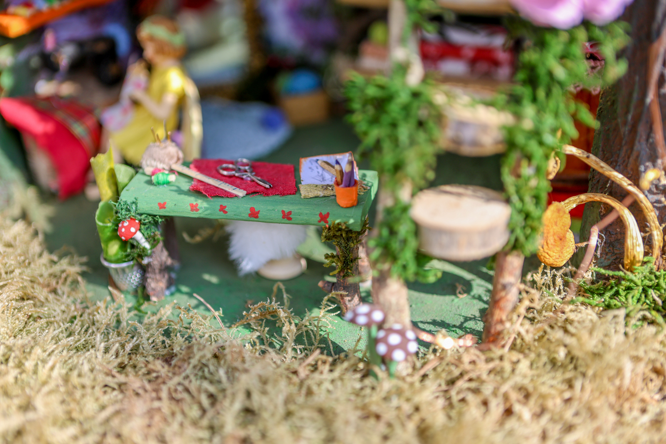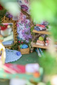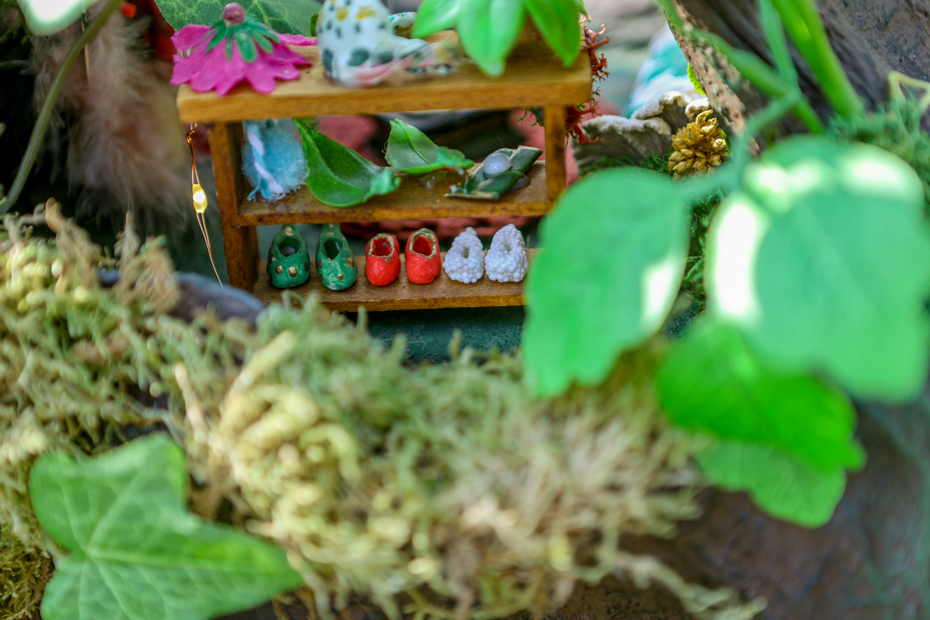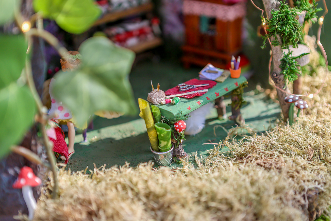 Οι νεράιδες είναι πολύ κοκέτες! Πάντα θέλουν να φορούν όμορφα ρούχα φτιαγμένα από υφάσματα μεταξωτά, ζωγραφισμένα με χρώματα από λουλούδια και φυτά και τα παπούτσια τους να είναι άνετα και γερά αλλά κομψά. Για αυτό και η μικρή μας νεράιδα δουλεύει πυρετωδώς για να ικανοποίησει κάθε επιθυμία τους στο εργαστήριο της, που βρίσκεται ανάμεσα σε χειροποίητα ξύλινα τεχνητά κλαδιά πάνω σε ξύλινη βάση καλυμμένη με φυσικά βρύα. Το εργαστήριο της είναι στολισμένο από τεχνητά λουλούδια γεμάτα χρώματα και χειροποίητα μανιταράκια.