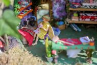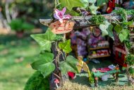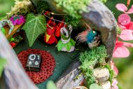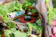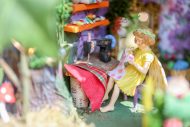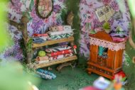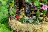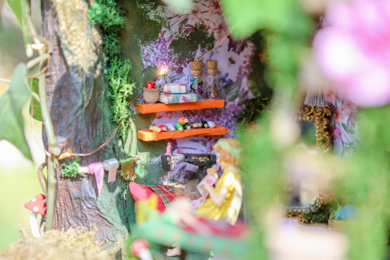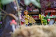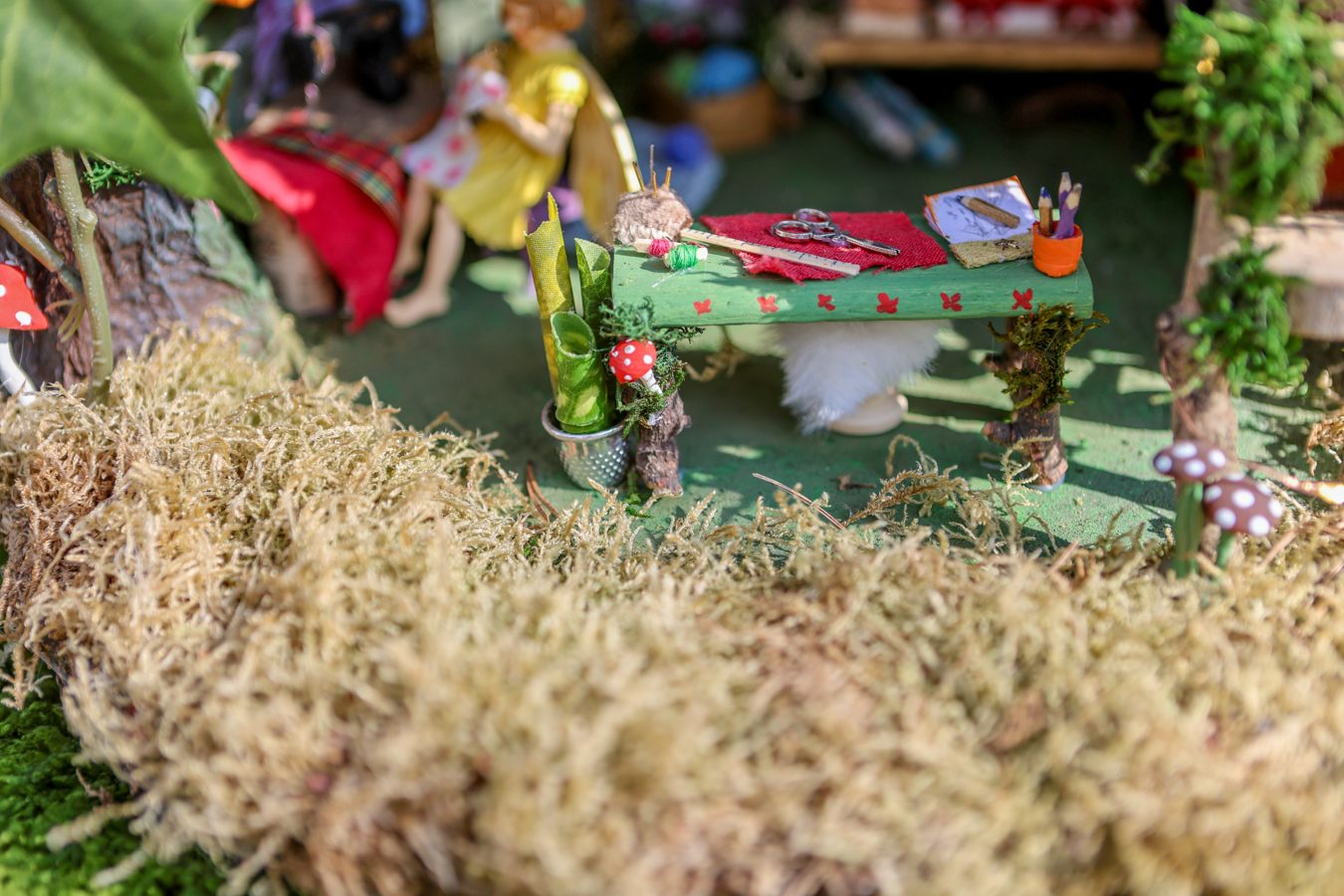 Οι νεράιδες είναι πολύ κοκέτες! Πάντα θέλουν να φορούν όμορφα ρούχα φτιαγμένα από υφάσματα μεταξωτά, ζωγραφισμένα με χρώματα από λουλούδια και φυτά και τα παπούτσια τους να είναι άνετα και γερά αλλά κομψά. Για αυτό και η μικρή μας νεράιδα δουλεύει πυρετωδώς για να ικανοποίησει κάθε επιθυμία τους στο εργαστήριο της, που βρίσκεται ανάμεσα σε χειροποίητα ξύλινα τεχνητά κλαδιά πάνω σε ξύλινη βάση καλυμμένη με φυσικά βρύα. Το εργαστήριο της είναι στολισμένο από τεχνητά λουλούδια γεμάτα χρώματα και χειροποίητα μανιταράκια.