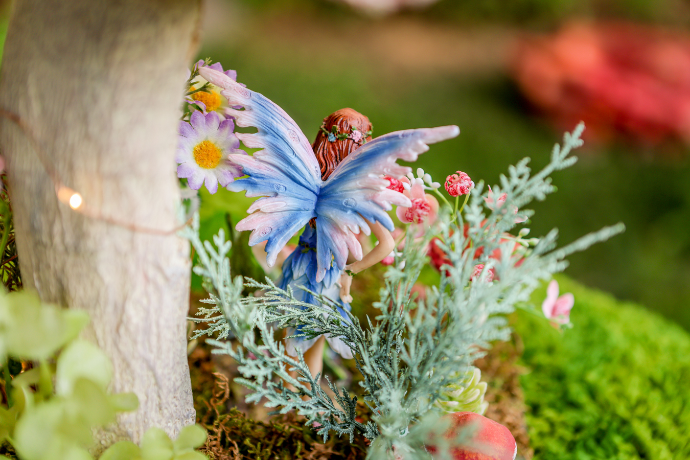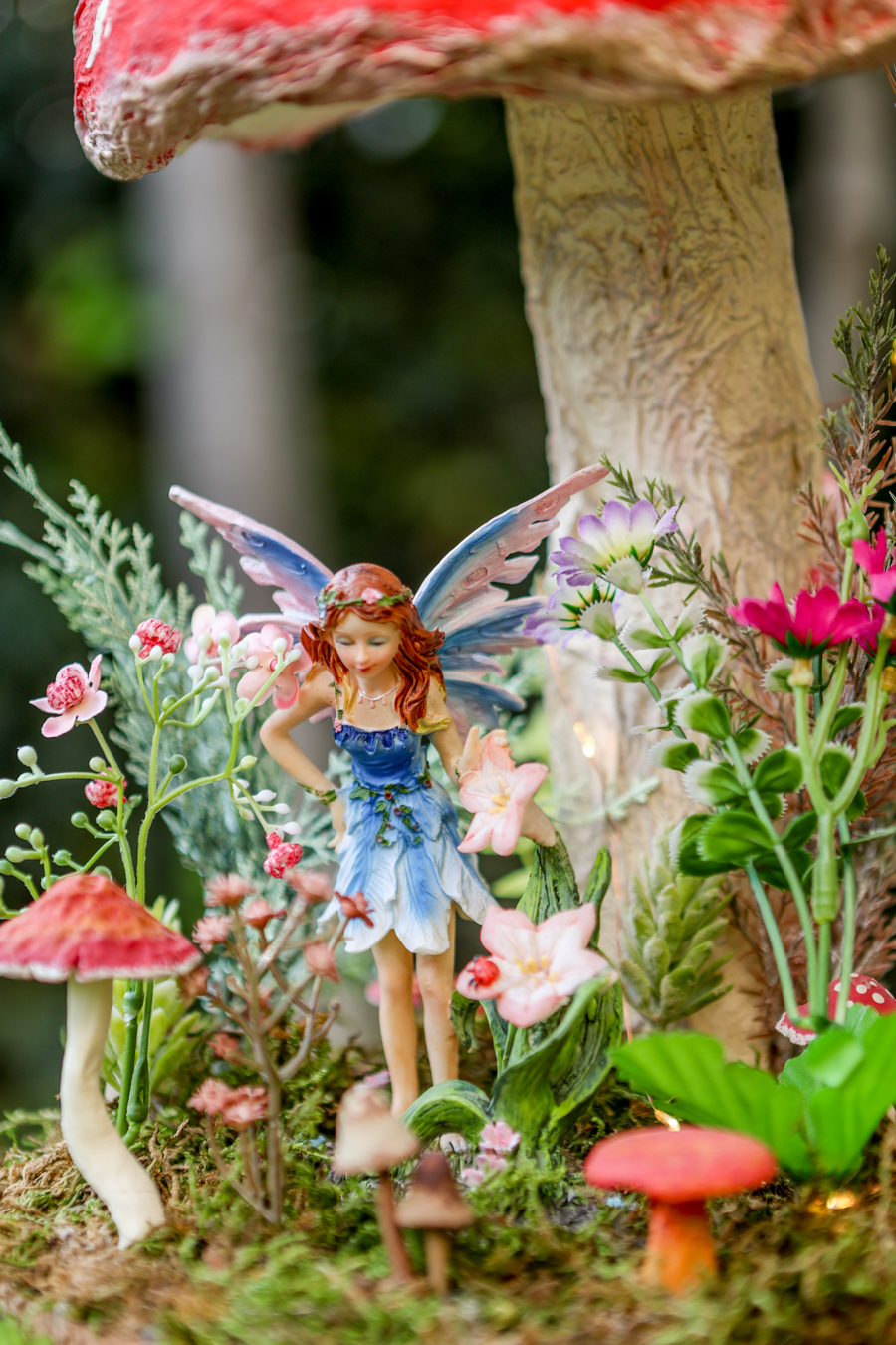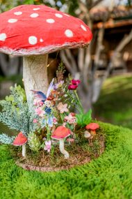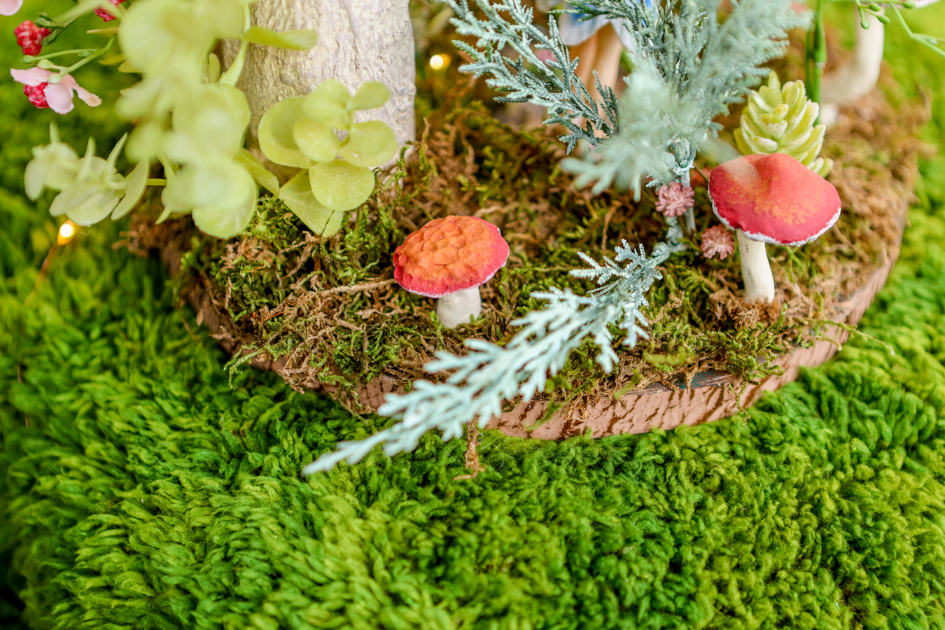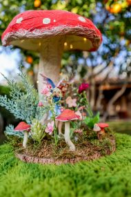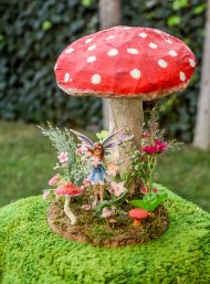 Σε αυτή τη μαγική κατασκευή, μια μικρή νεράιδα έχει βρει καταφύγιο σε ένα δαχτυλίδι μανιταριών. Τα δαχτυλίδια μανιταριών λέγεται ότι είναι οι πύλες για τον κόσμο των νεραιδών. Η σκηνή είναι τοποθετημένη πάνω σε μια ξύλινη βάση, διακοσμημένη με επεξεργασμένα φυσικά βρύα και τεχνητά λουλούδια, δημιουργώντας ένα παραμυθένιο τοπίο.