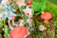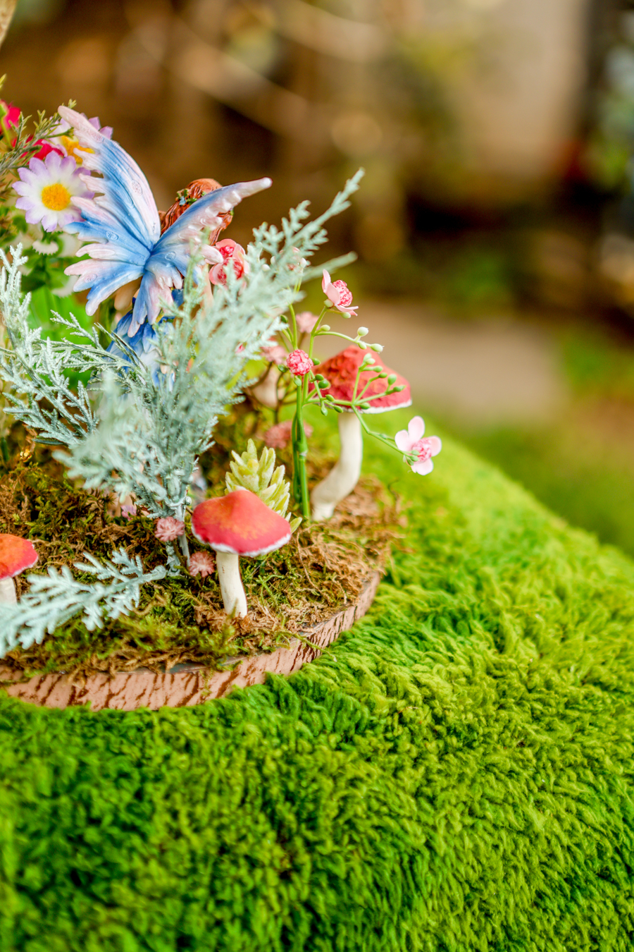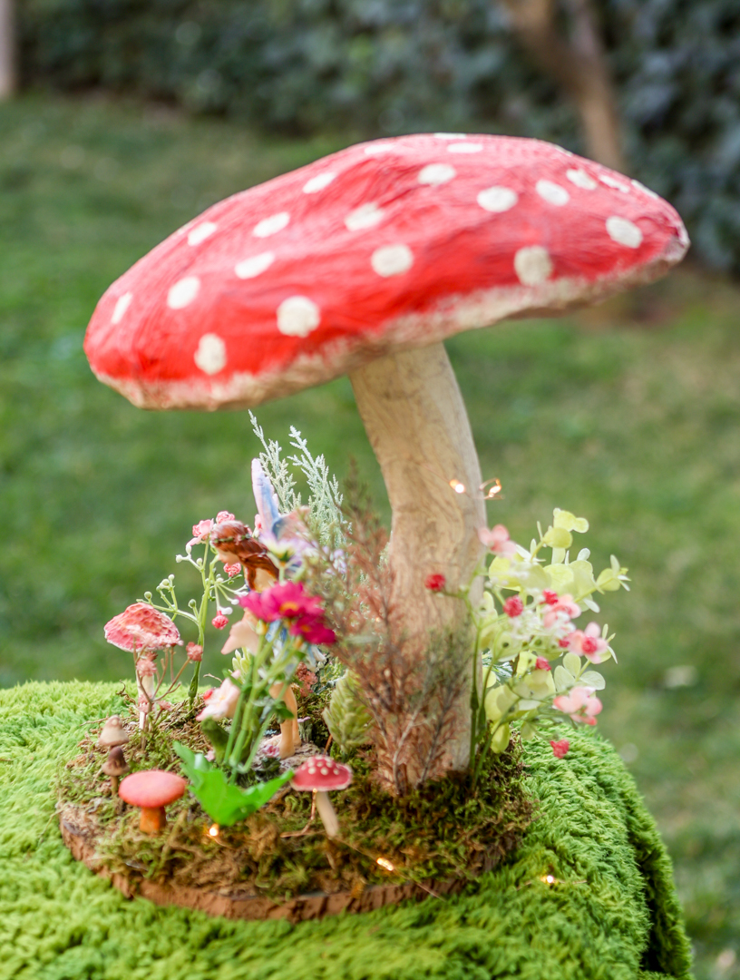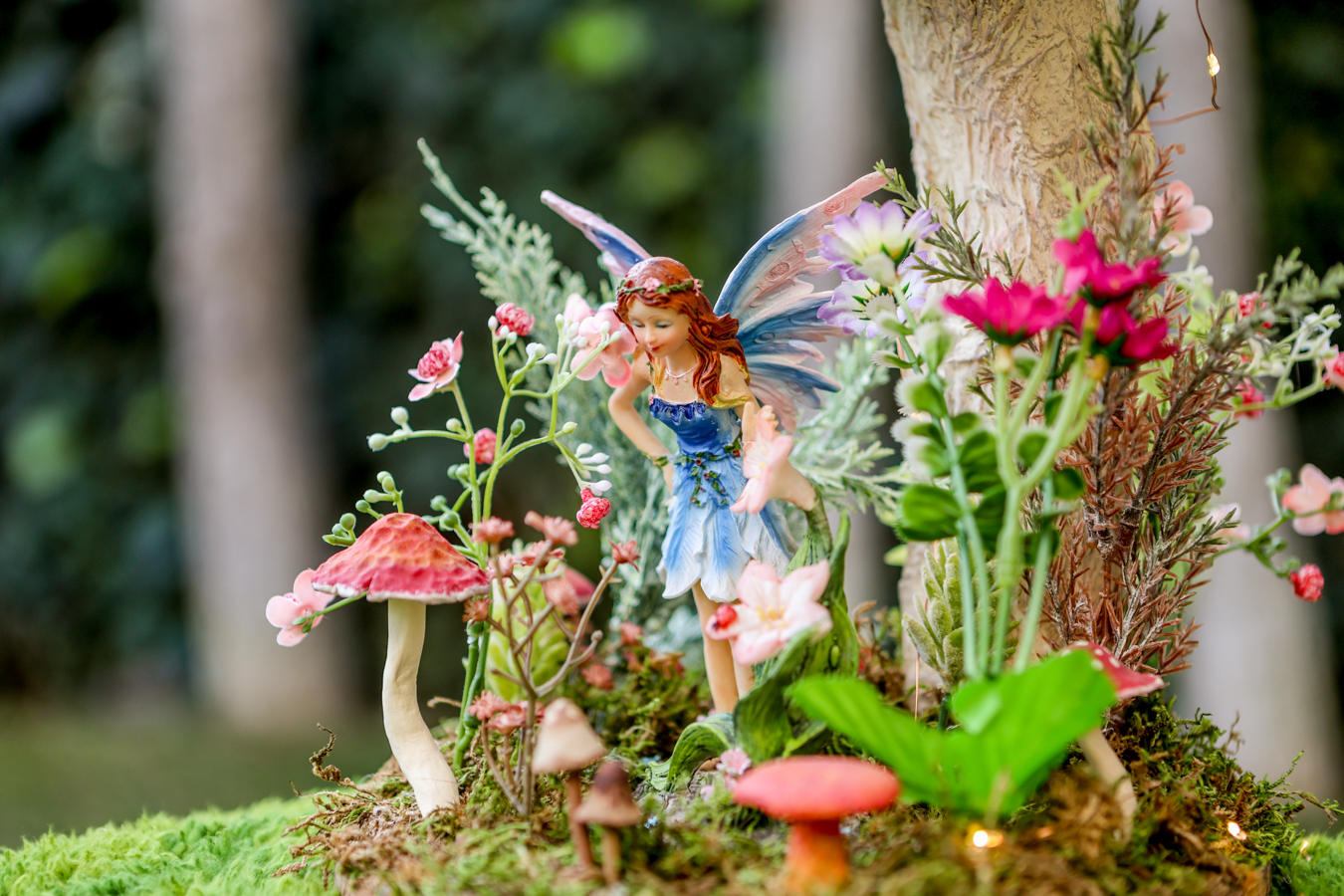 Σε αυτή τη μαγική κατασκευή, μια μικρή νεράιδα έχει βρει καταφύγιο σε ένα δαχτυλίδι μανιταριών. Τα δαχτυλίδια μανιταριών λέγεται ότι είναι οι πύλες για τον κόσμο των νεραιδών. Η σκηνή είναι τοποθετημένη πάνω σε μια ξύλινη βάση, διακοσμημένη με επεξεργασμένα φυσικά βρύα και τεχνητά λουλούδια, δημιουργώντας ένα παραμυθένιο τοπίο.
