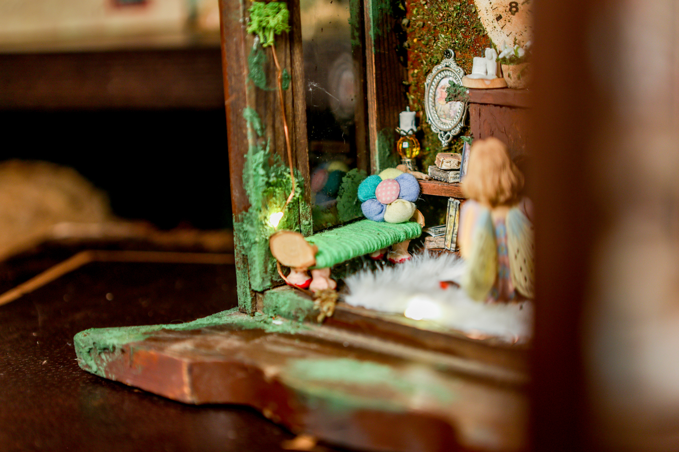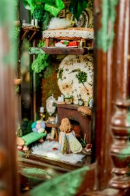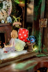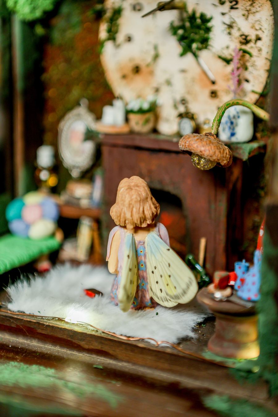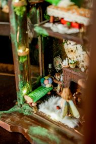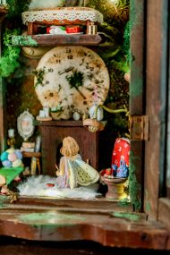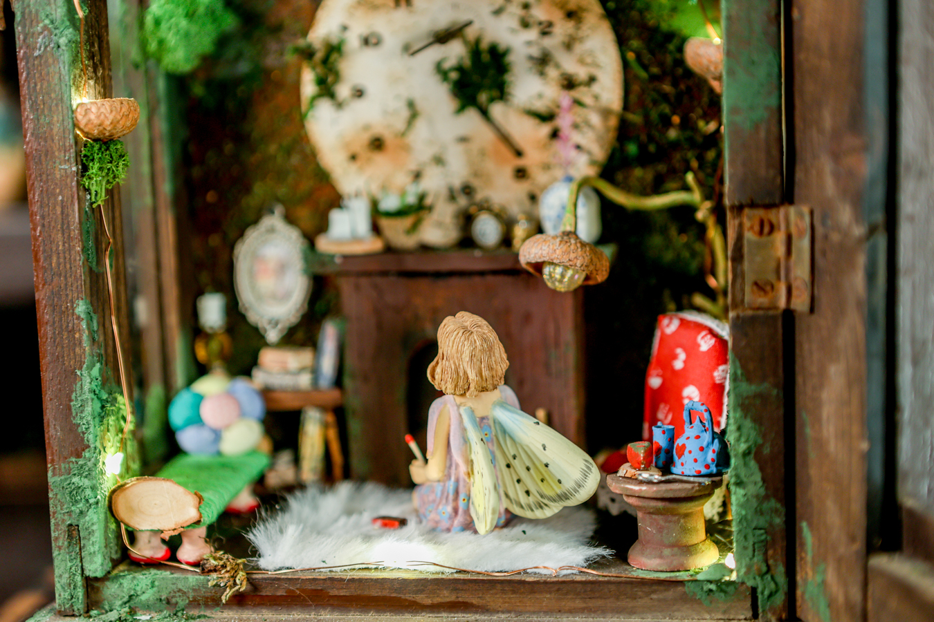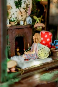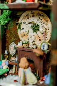 An old pendulum wooden clock has become the home of a little fairy. She transformed it into a cozy little house where she could sit and read stories from her tiny books in front of the fireplace or drink warm nectar in her comfy armchair, with the lights making the space even more magical. When she gets sleepy, she’ll lie down on her soft bed to dream of adventures with her friends, the other fairies. She has decorated it with various items, all handmade with love and lots of fairy dust.