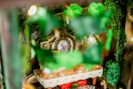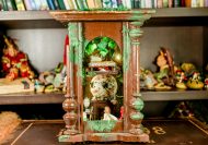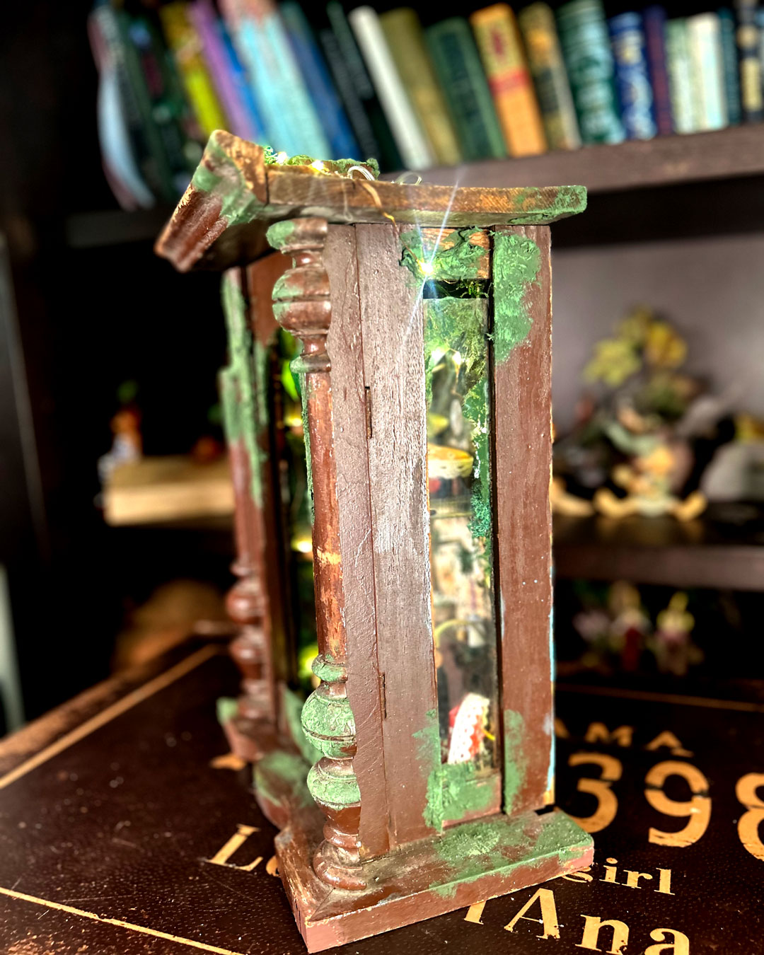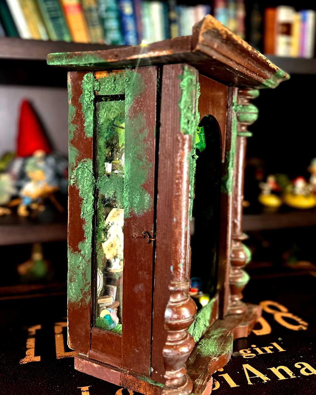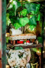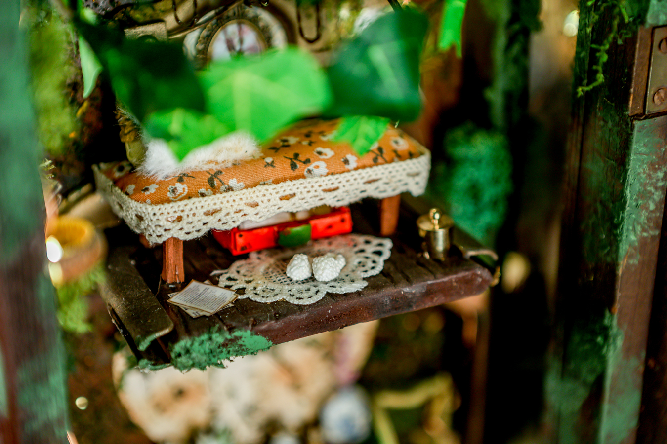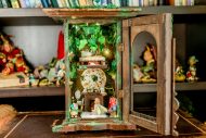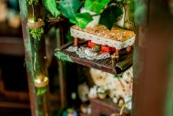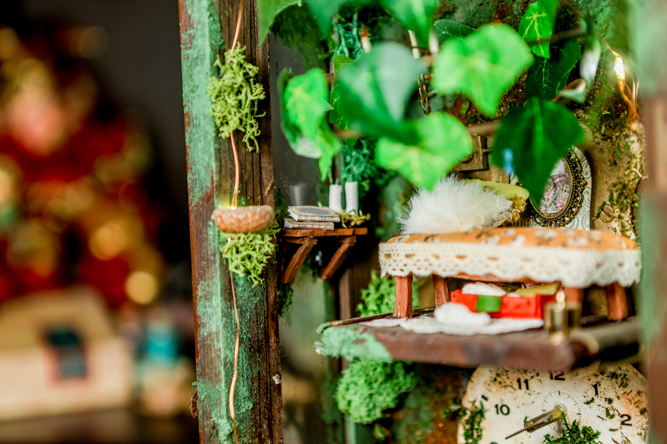An old pendulum wooden clock has become the home of a little fairy. She transformed it into a cozy little house where she could sit and read stories from her tiny books in front of the fireplace or drink warm nectar in her comfy armchair, with the lights making the space even more magical. When she gets sleepy, she’ll lie down on her soft bed to dream of adventures with her friends, the other fairies. She has decorated it with various items, all handmade with love and lots of fairy dust.