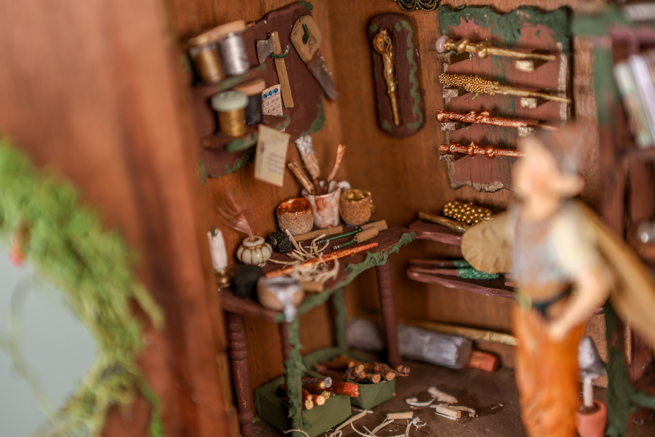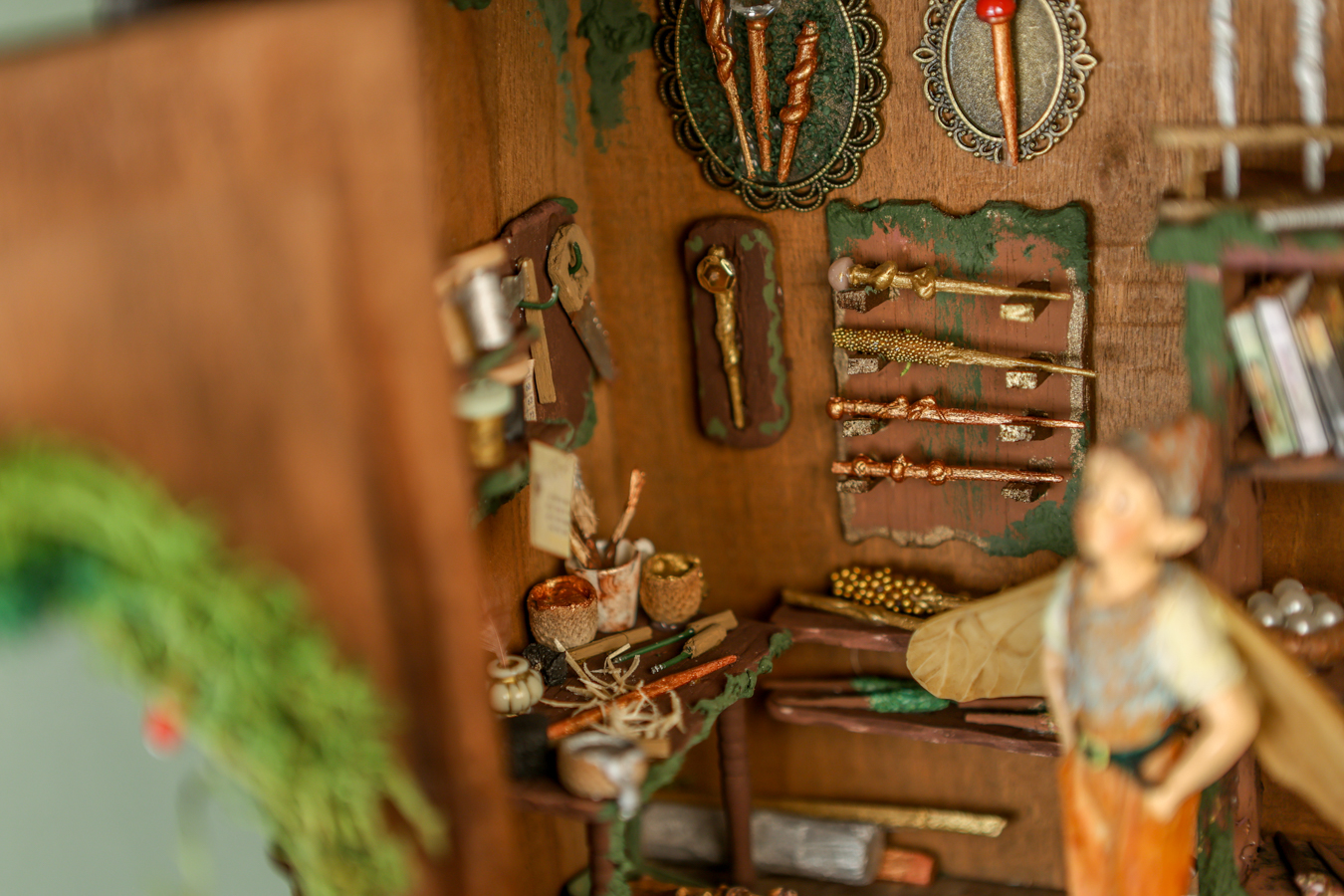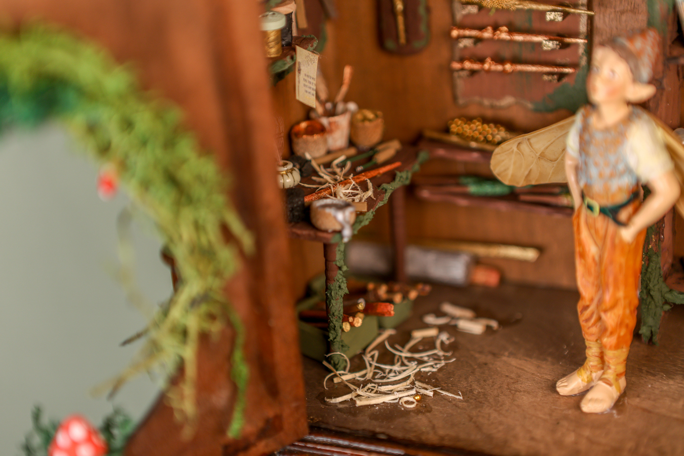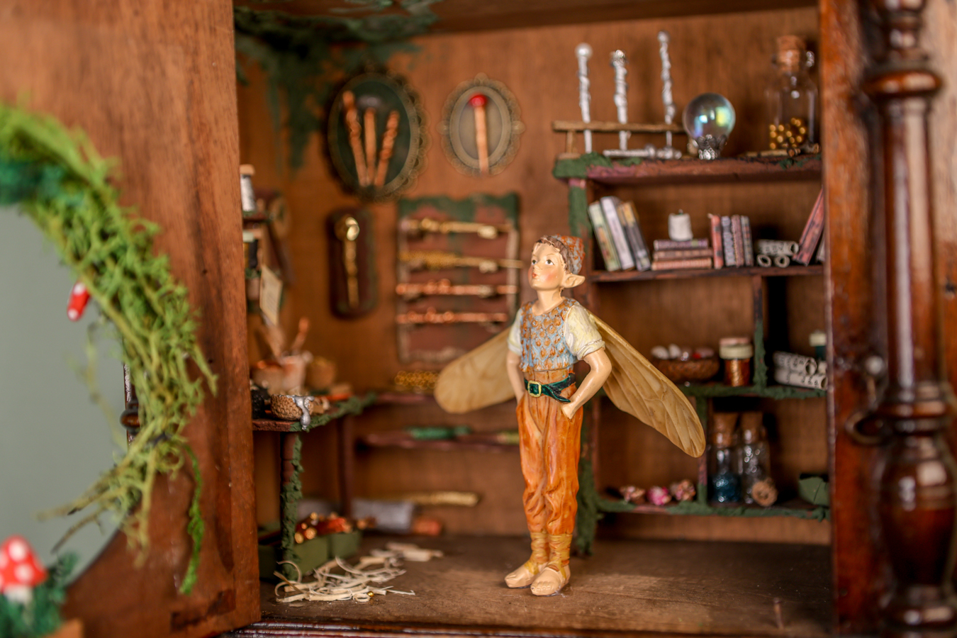 An old wooden hanging box, transformed by the little fairy, into a workshop where he creates his magical wands. Inside his workshop, there’s a workbench where he crafts them with all sorts of tools, a handmade wooden library with fairy books that cover everything he needs to know about making them correctly and their properties, and of course, the fairy dust without which, nothing would be possible.