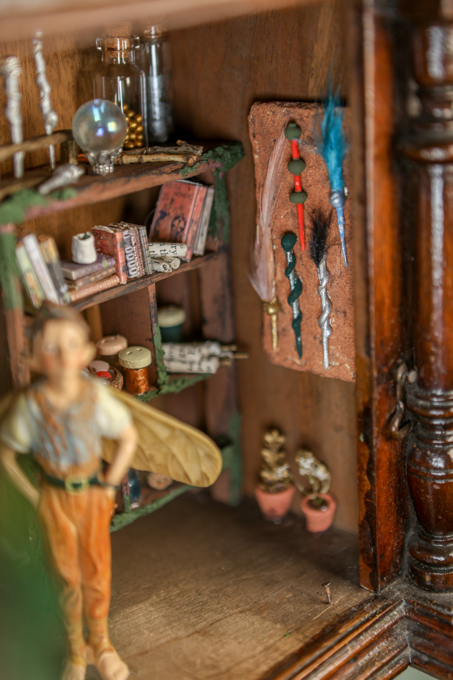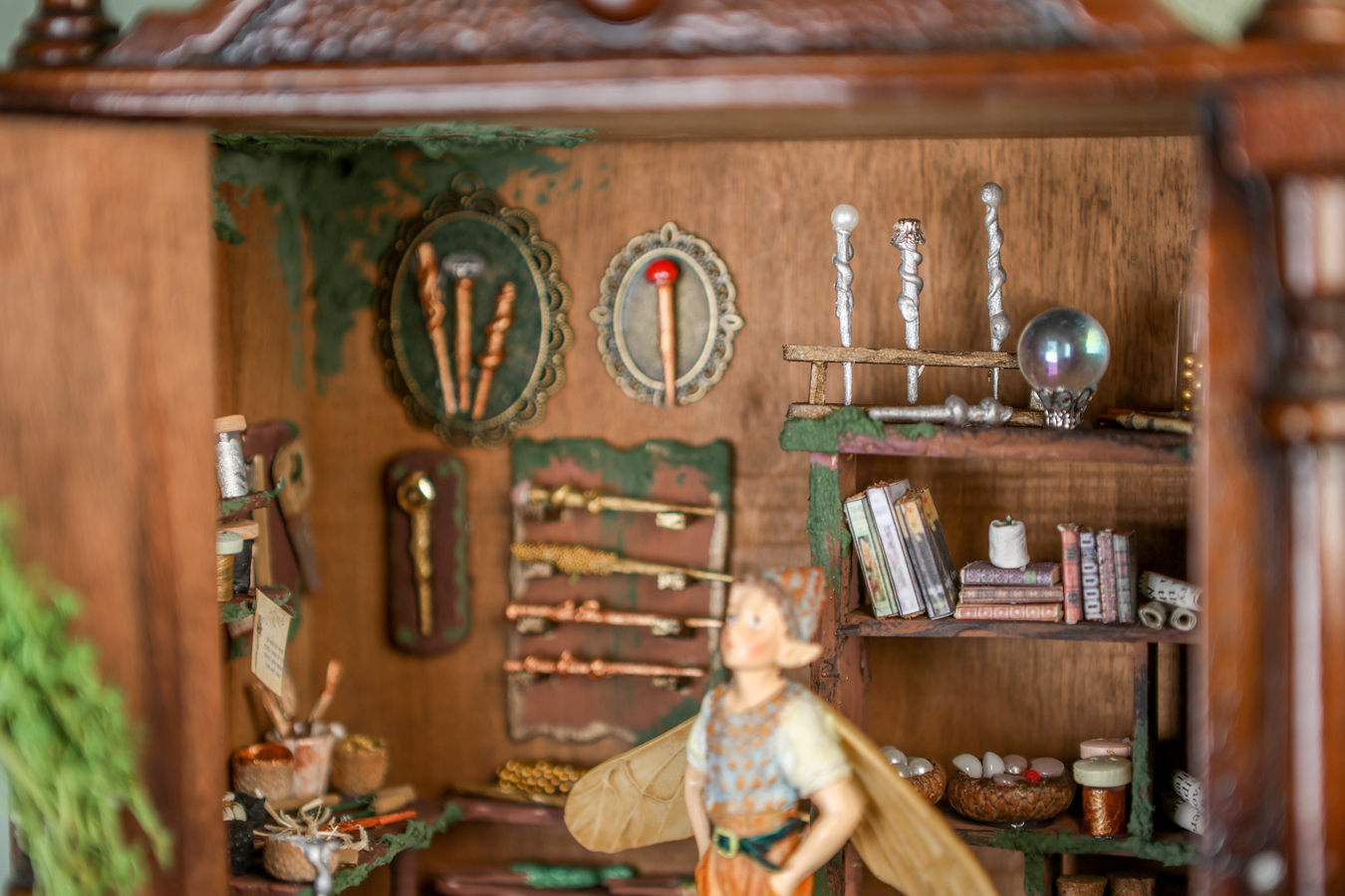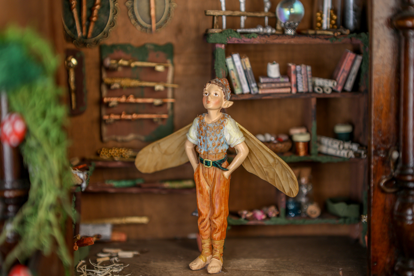 An old wooden hanging box, transformed by the little fairy, into a workshop where he creates his magical wands. Inside his workshop, there’s a workbench where he crafts them with all sorts of tools, a handmade wooden library with fairy books that cover everything he needs to know about making them correctly and their properties, and of course, the fairy dust without which, nothing would be possible.