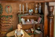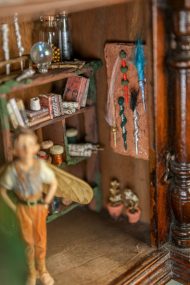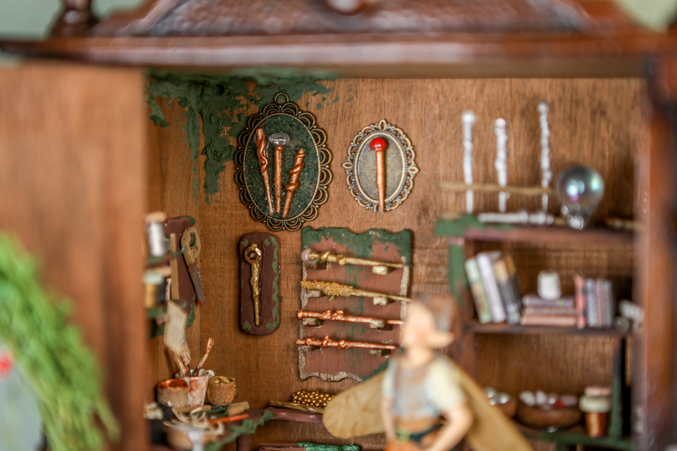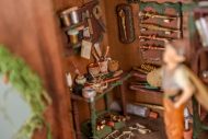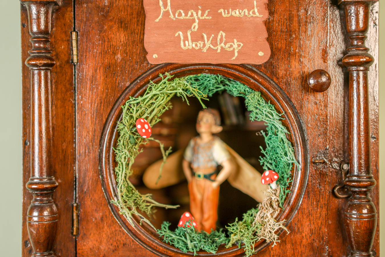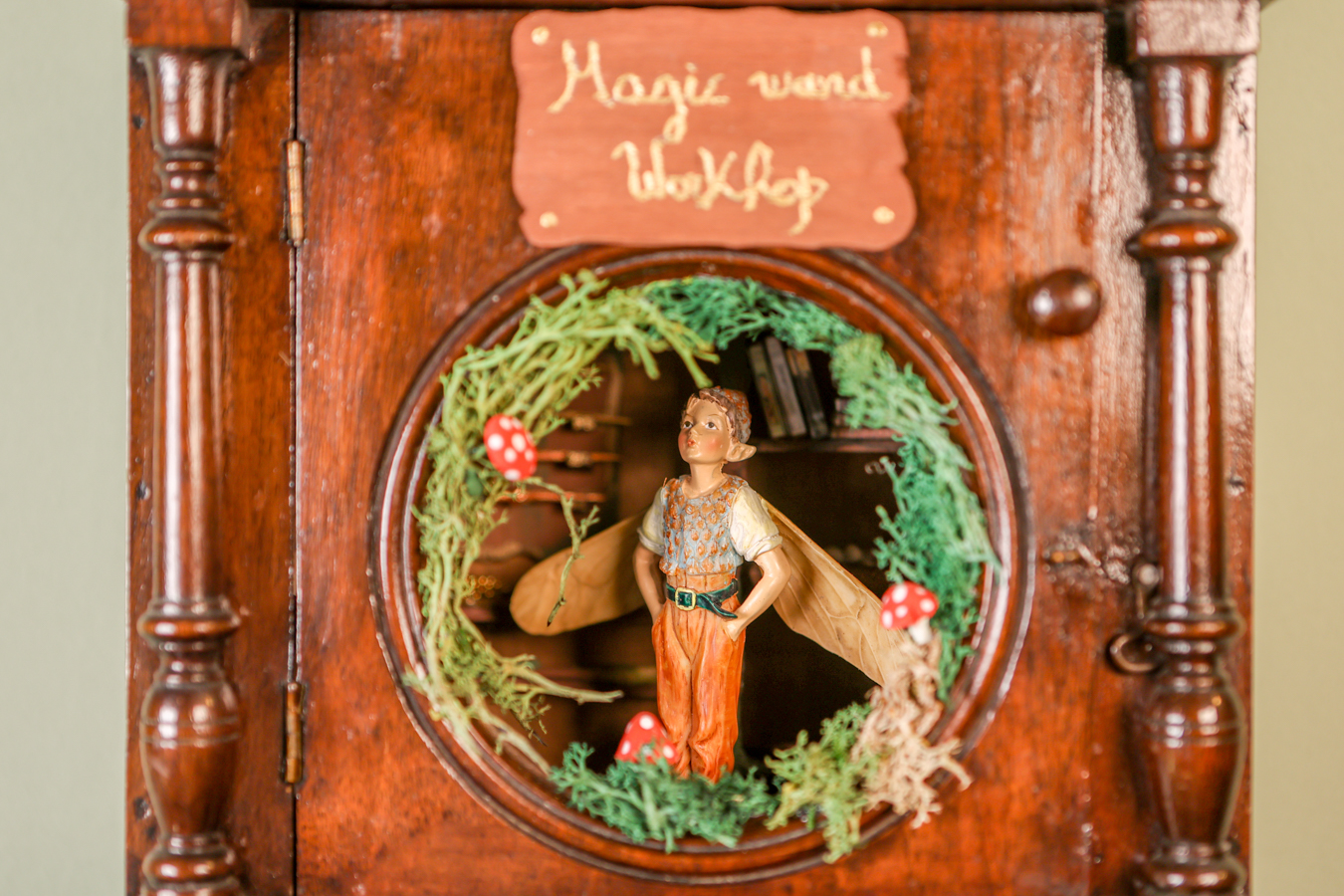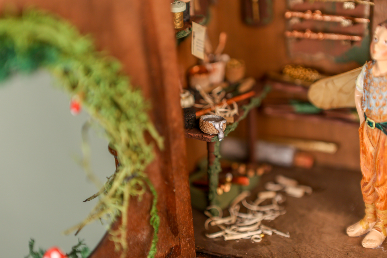 An old wooden hanging box, transformed by the little fairy, into a workshop where he creates his magical wands. Inside his workshop, there’s a workbench where he crafts them with all sorts of tools, a handmade wooden library with fairy books that cover everything he needs to know about making them correctly and their properties, and of course, the fairy dust without which, nothing would be possible.