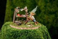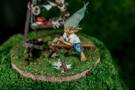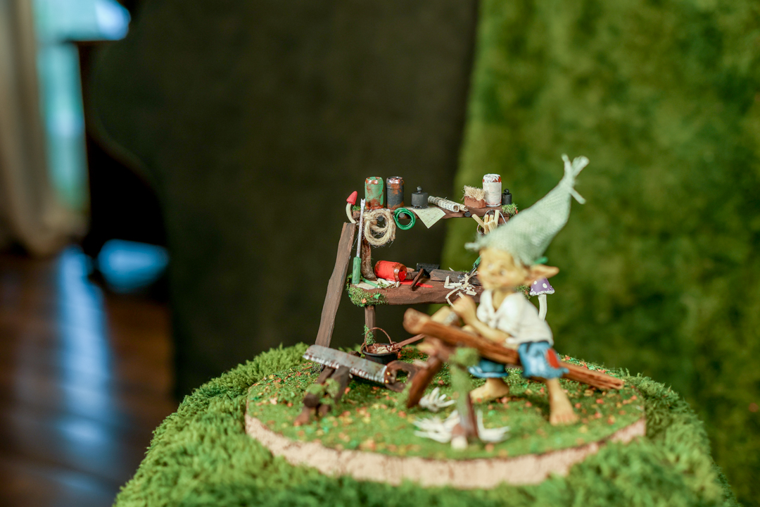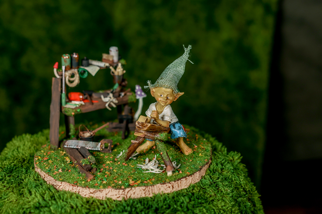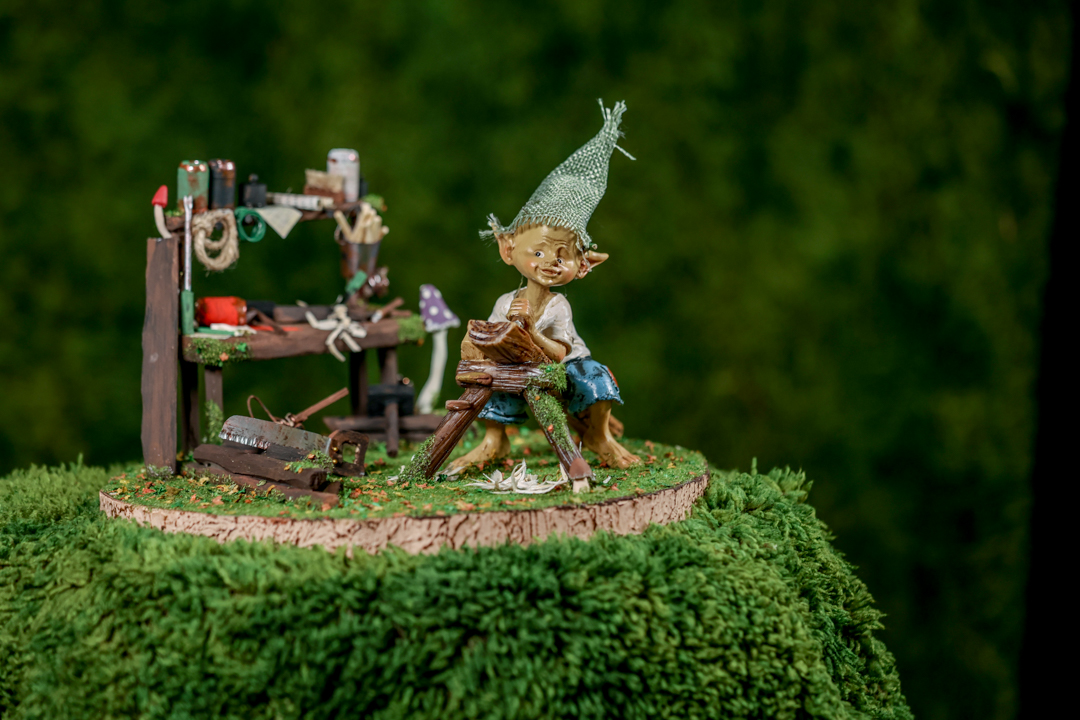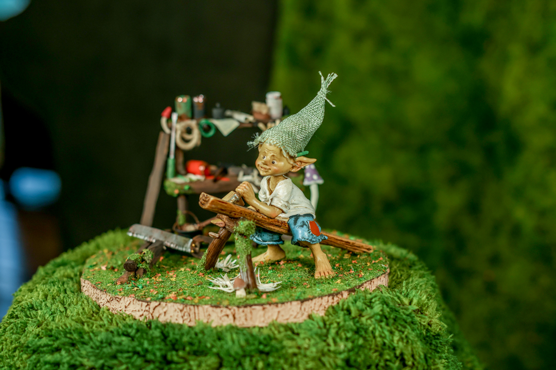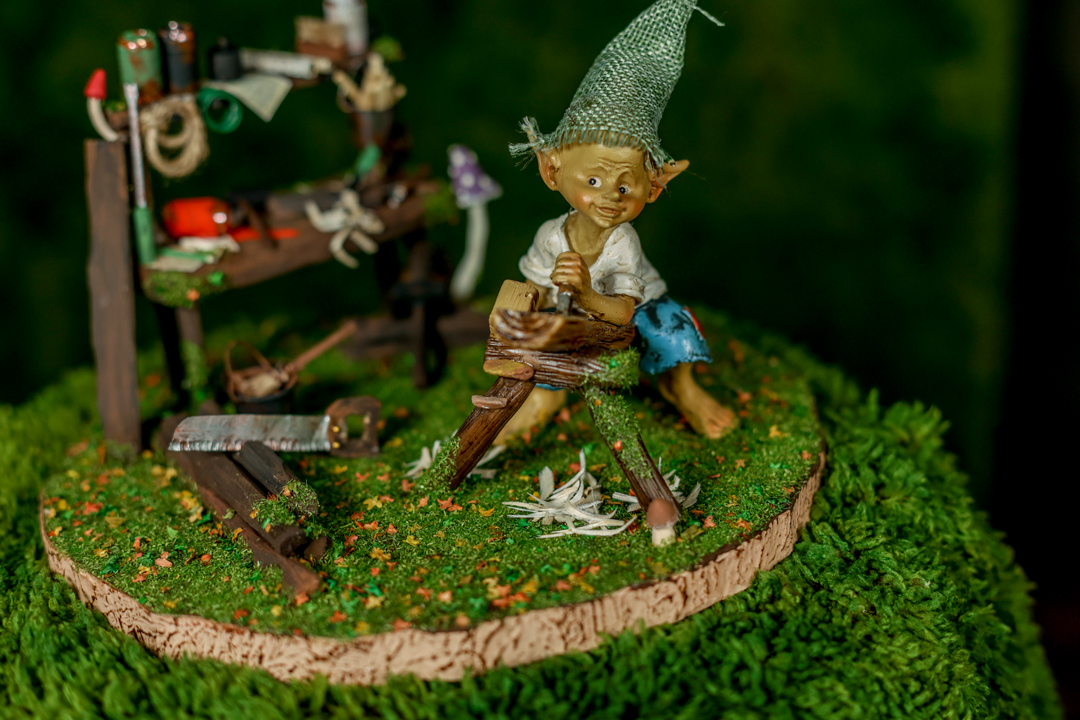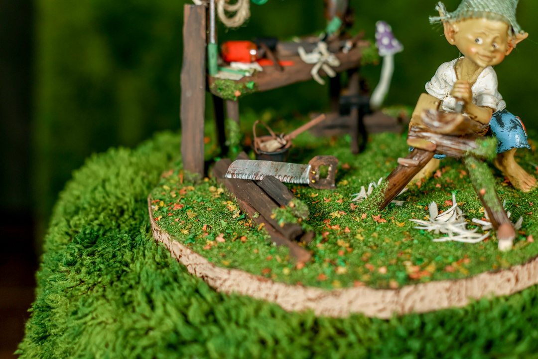 Φανταστείτε ένα μικρό ξυλουργικό εργαστήριο, κρυμμένο μέσα στη φύση. Σε μια στρογγυλή ξύλινη βάση, καλυμμένη με τεχνητή πρασινάδα και διακοσμημένη με χειροποίητα μανιταράκια, βρίσκεται το εργαστήριο του μικρού ξωτικού .