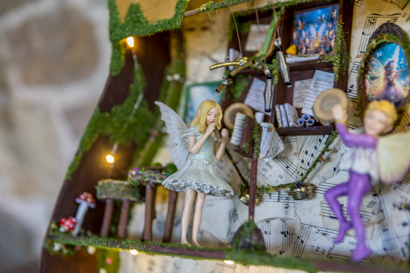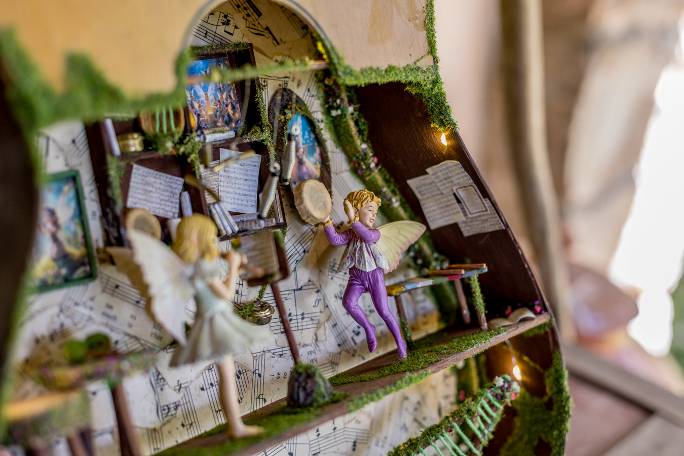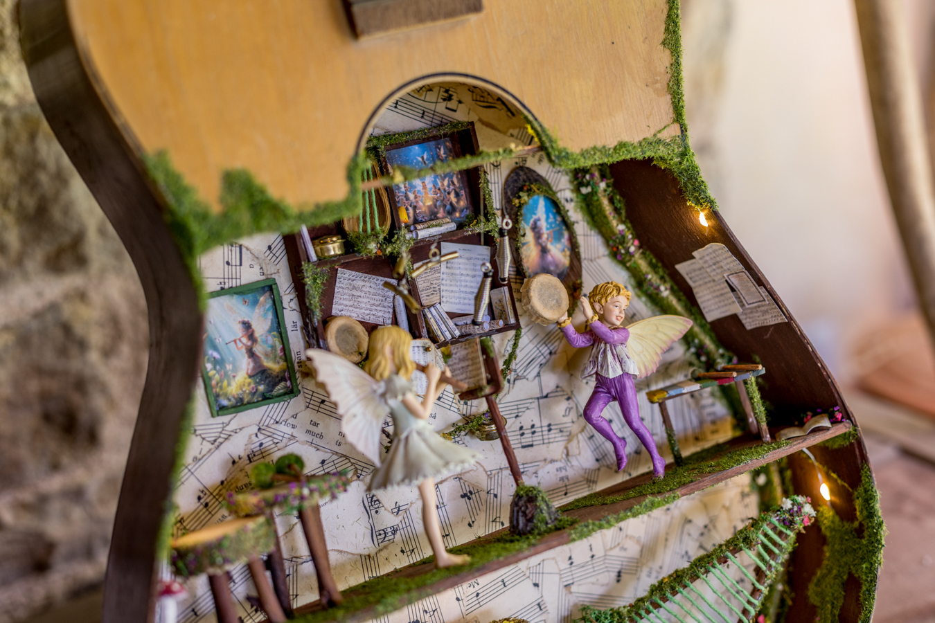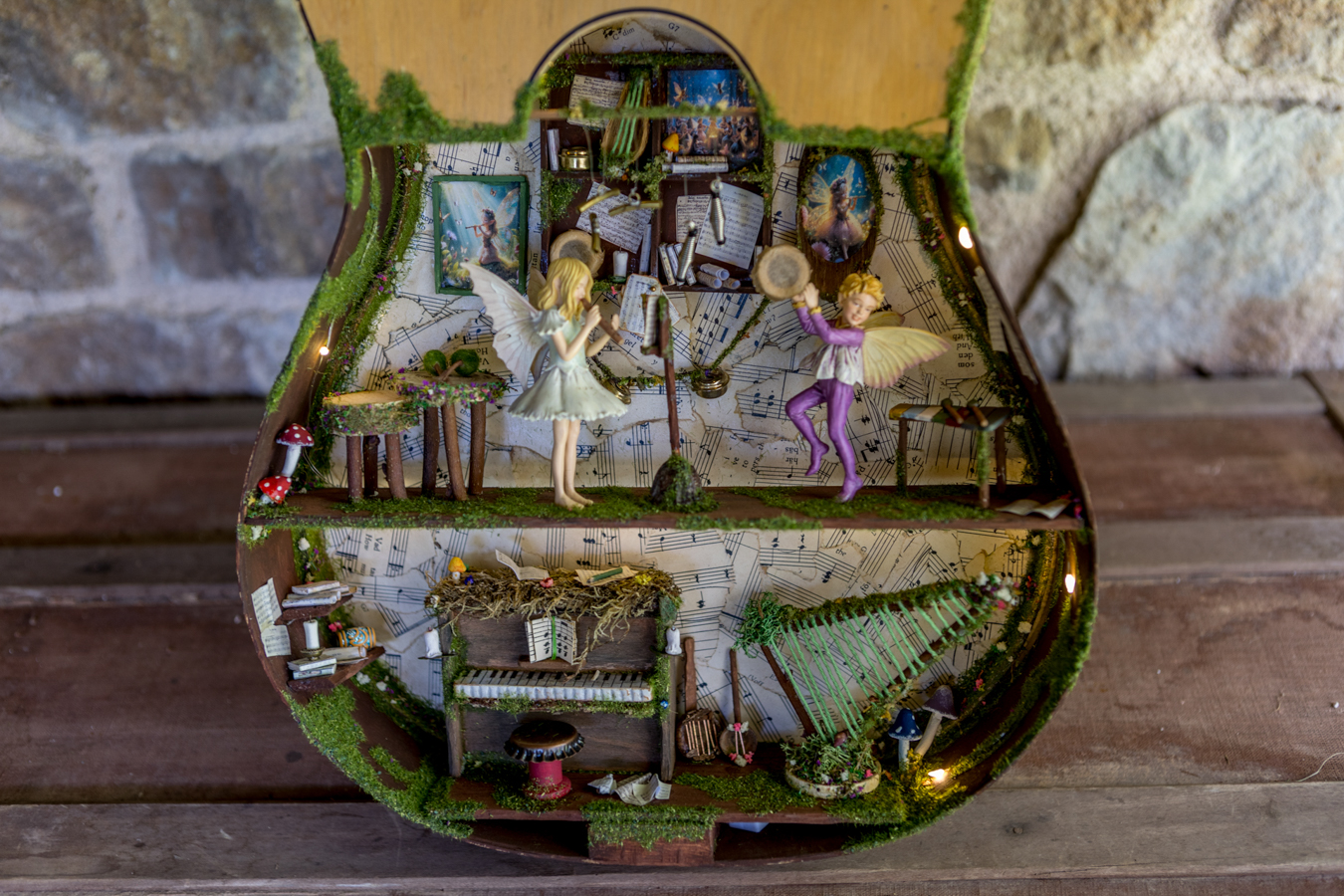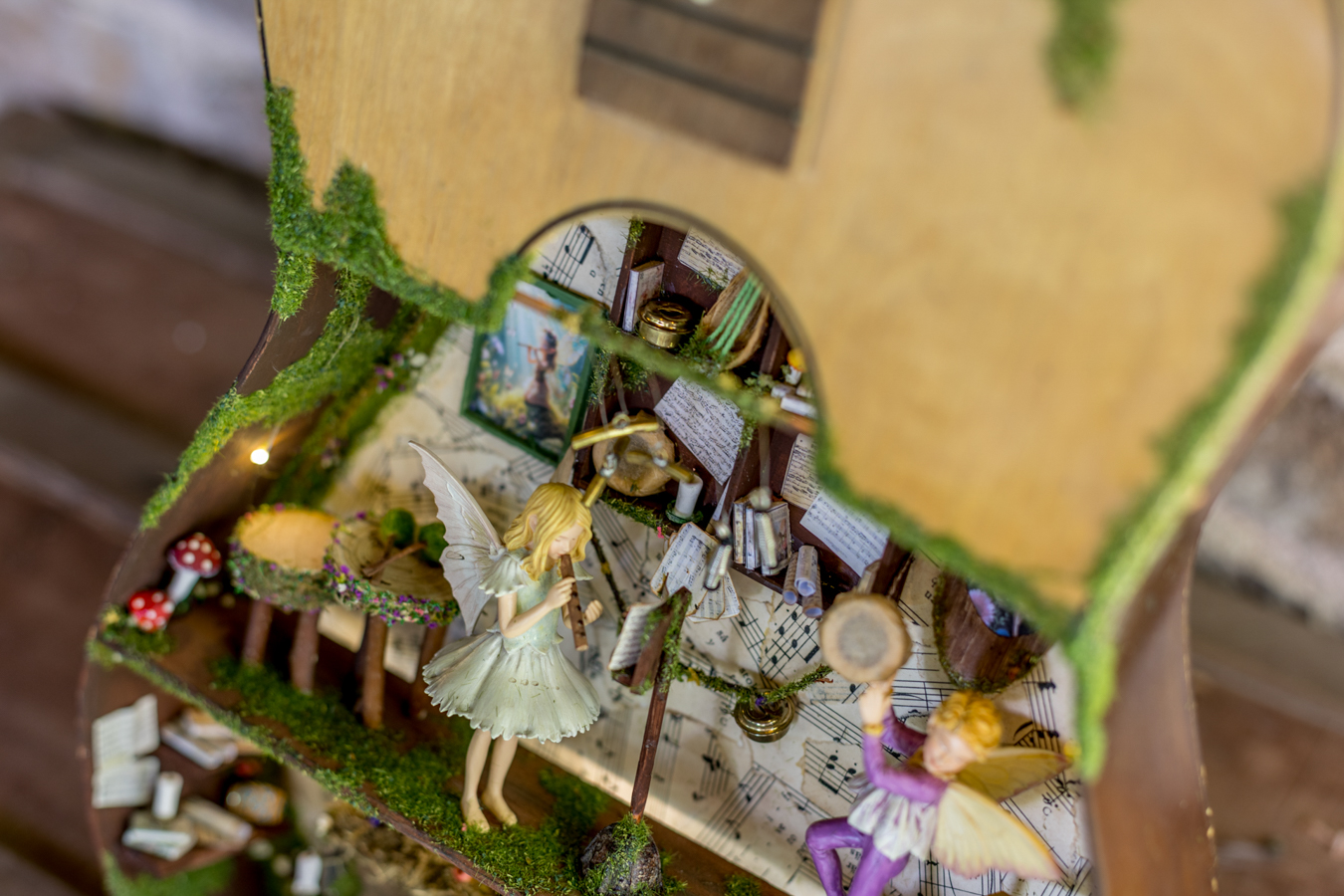 Inside the wooden body of the guitar, a world of melodies came to life. A piano crafted from natural materials, a harp made of slender twigs and strings spun by dragonflies, drums from tree bark, a xylophone that chirps like birdsong, and other magical instruments await the forest’s little musicians. Soft fairy lights bathe the interior in a gentle glow, while artificial moss and wood create a setting filled with music and enchantment.