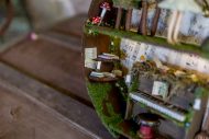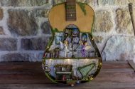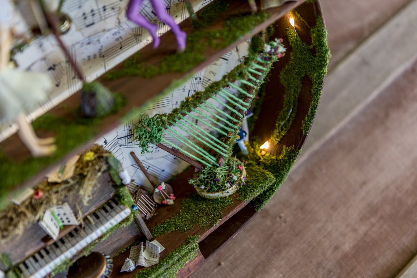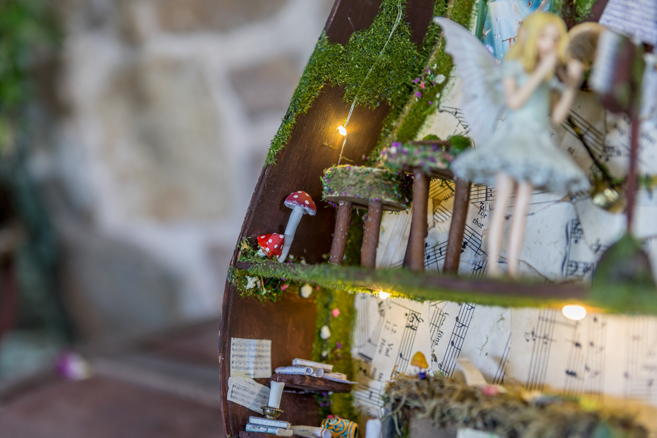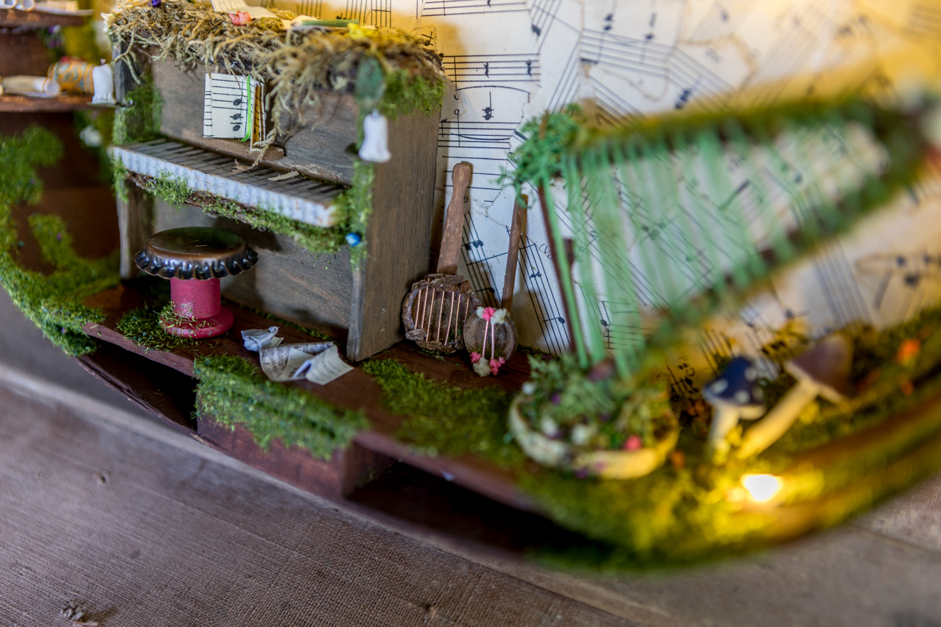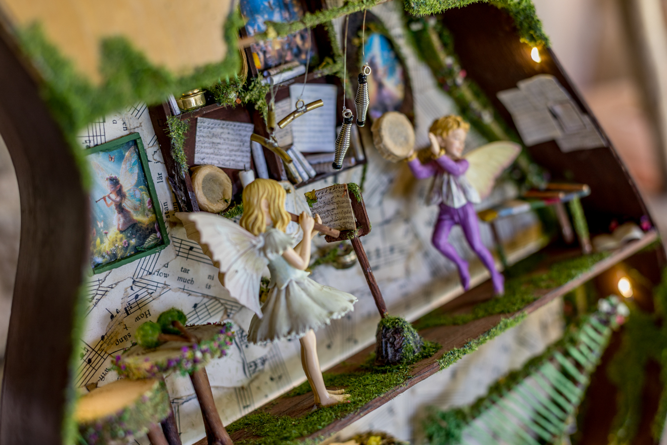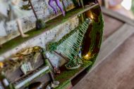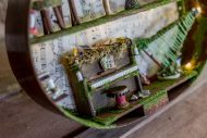 Inside the wooden body of the guitar, a world of melodies came to life. A piano crafted from natural materials, a harp made of slender twigs and strings spun by dragonflies, drums from tree bark, a xylophone that chirps like birdsong, and other magical instruments await the forest’s little musicians. Soft fairy lights bathe the interior in a gentle glow, while artificial moss and wood create a setting filled with music and enchantment.